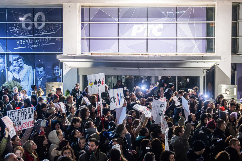 Students gathered in front of the Radio Television of Serbia building due to being dissatisfied by the reporting of the public media service. The gathering was organised during the chief news broadcast Dnevnik 2.