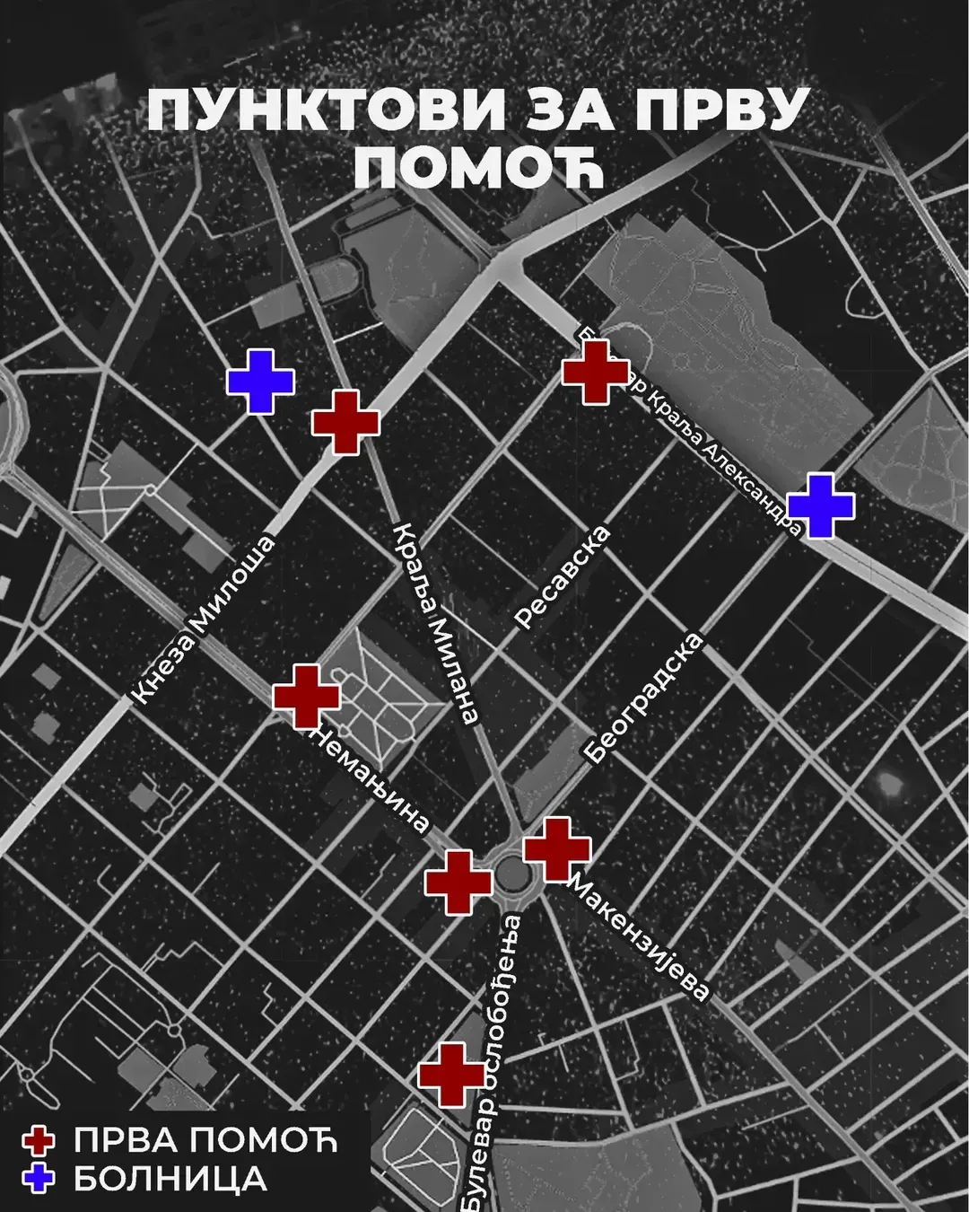 U slučaju da se ne osećate dobro, obratite se najbližem redaru ili prvoj pomoći (mapa punktova je na sledećoj slici).