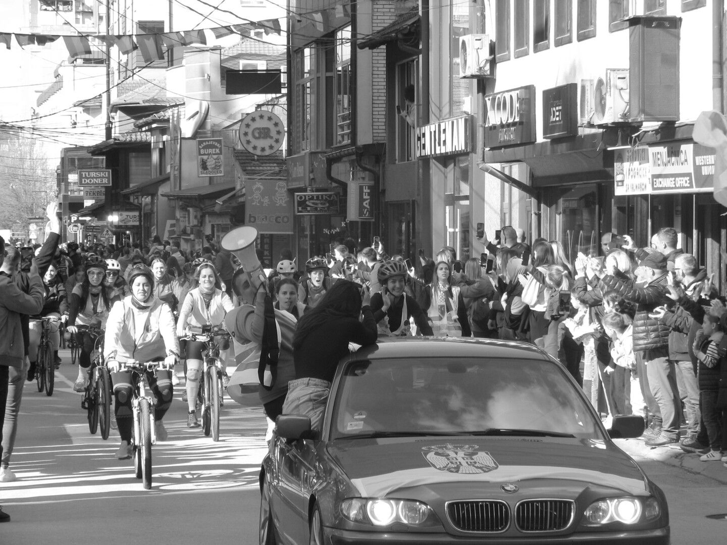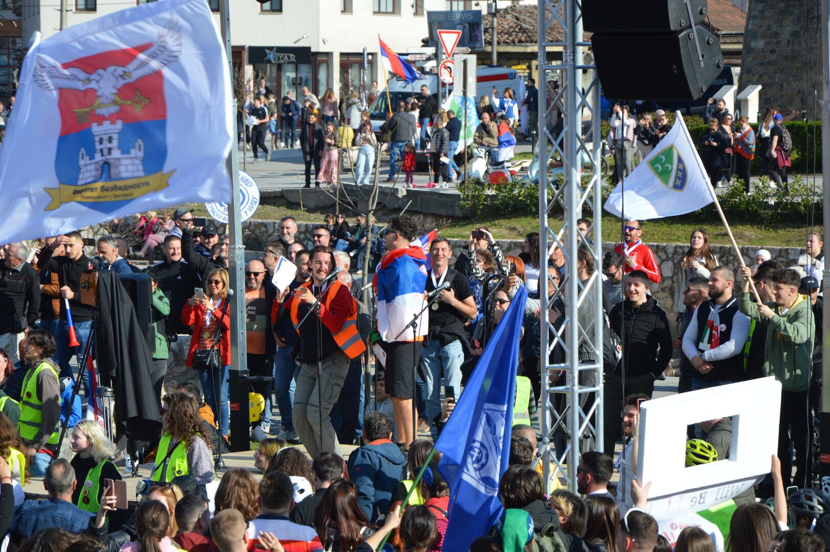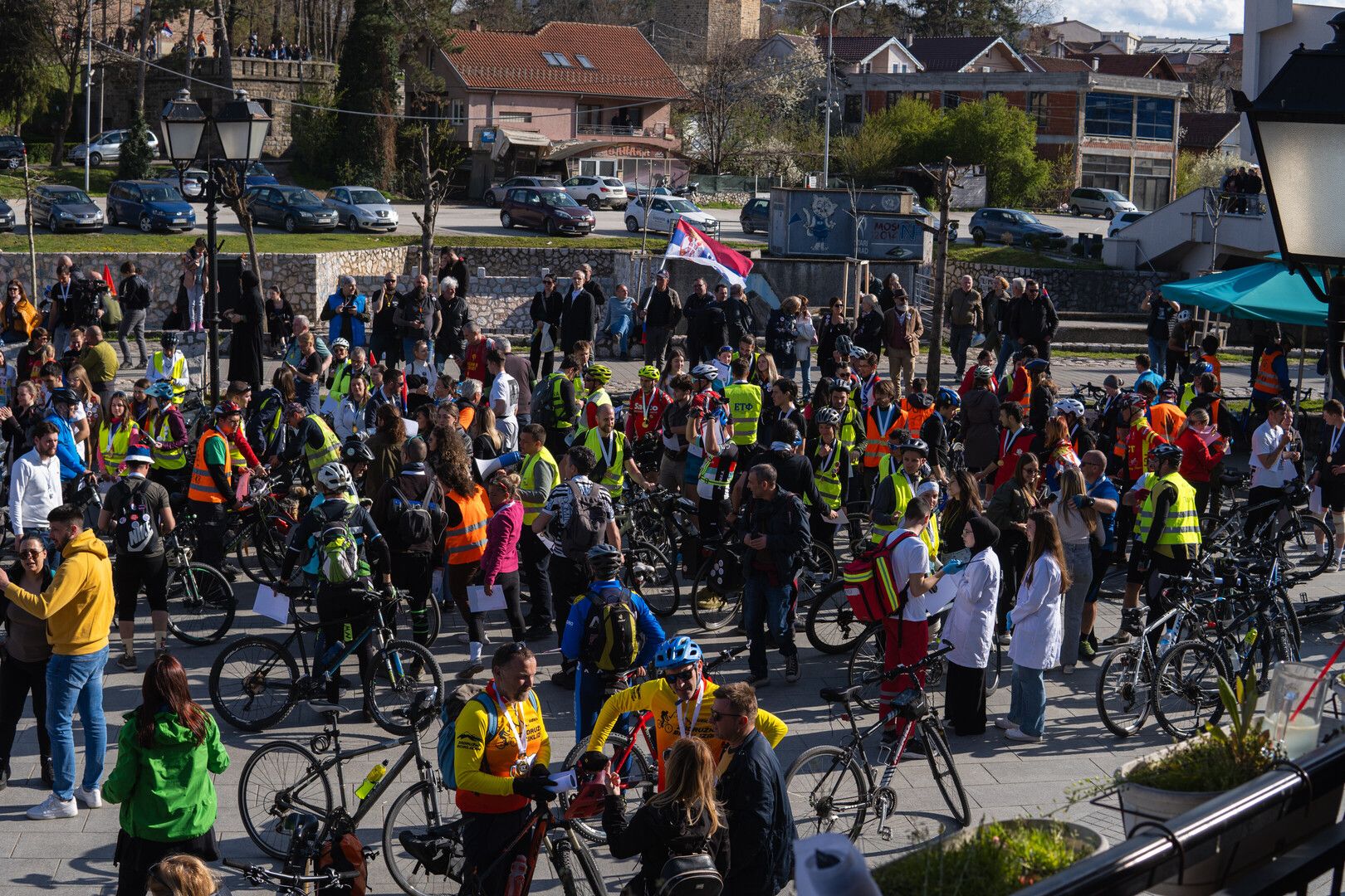 На трг су управо стигли бициклисти из Новог Сада, који су дочекани овацијама и песмом.